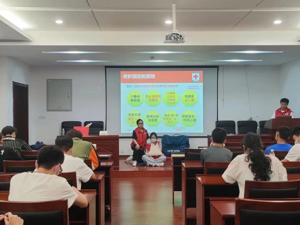 活动开始,校红十字会魏泽、刘颖同学以地震灾害的逃生方法为切入点,围绕突发事件自救互救,对急救过程中的注意事项进行了重点介绍,详细讲解并演示心肺复苏技能、基本包扎方法、体外自动除颤仪(AED)使用方法。